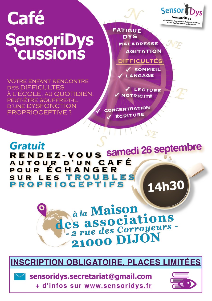 C’est avec grand plaisir que nous vous annonçons la mise en place des Cafés SensoriDys’cussions. Dans un premier temps, sur Dijon, mais nous espérons bien développer le concept par la suite ailleurs en France. Sensoridys est d’abord née sur Internet, lieu virtuel qui permet à des personnes éloignées rencontrant une même problématique de se rencontrer et d’échanger facilement en s’affranchissant de toute contrainte matérielle.
