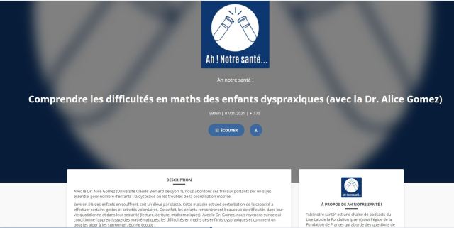 Je vous recommande d’écouter aussi ce podcast, où le Dr. Alice Gomez (Université Claude Bernard de Lyon 1) nous explique ses travaux portants sur la dyspraxie et l’apprentissage des mathématiques (clic sur l’image) :