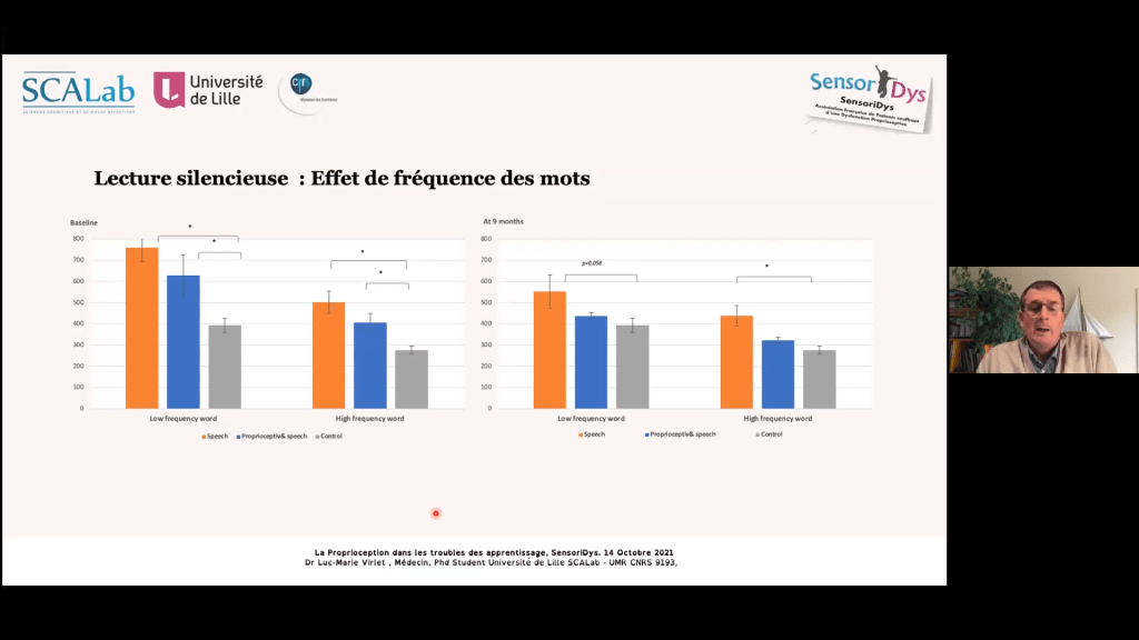 Puis il nous a présenté son étude qui montre l’intérêt et la supériorité de la prise en charge proprioceptive + orthophonique par rapport à la prise en charge orthophonique seule. La magie d’internet aidant, il y avait pour suivre cette visioconférence des personnes du Liban, du Burundi, de Suisse, de Belgique et d’Allemagne. Un grand merci au Dr Luc Virlet pour sa présentation extrêmement intéressante.