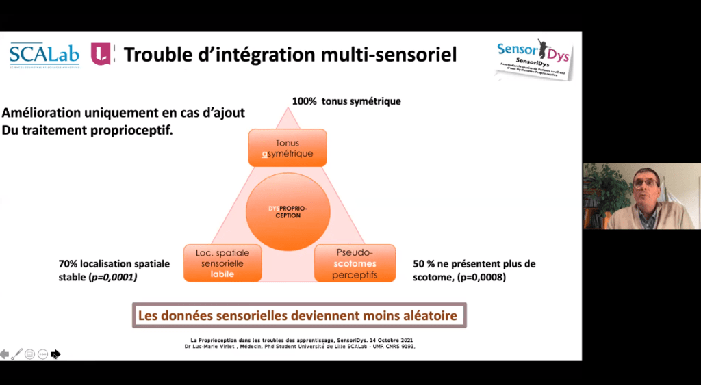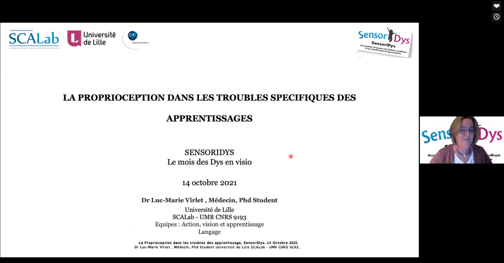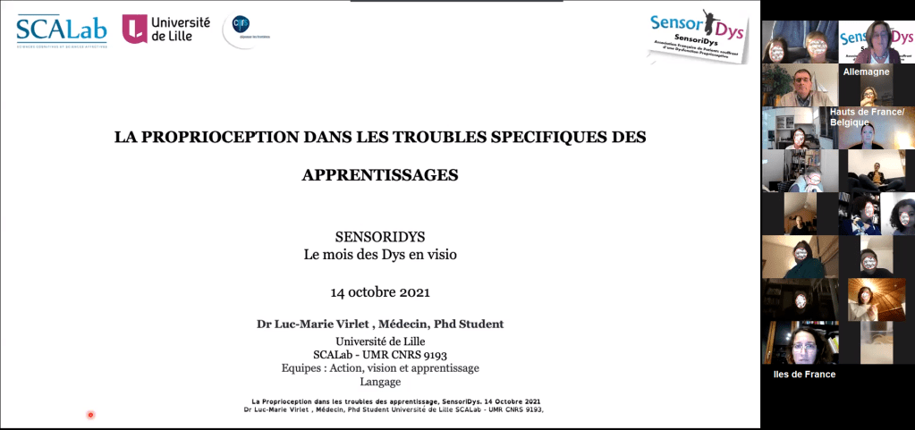 Le mois des dys de Sensoridys est maintenant terminé. Du fait d’un événement imprévu, nous avons été obligés de décaler des dates de nos visioconférences. C’est donc le Dr Luc virlet qui a ouvert notre mois des Dys avec sa conférence « La proprioception dans les troubles spécifiques des apprentissages », le jeudi 14 octobre. Il nous a parlé de la proprioception, de ses rôles, du lien entre une dysfonction de ce sens et les troubles spécifiques des apprentissages, ainsi que du traitement proprioceptif.
