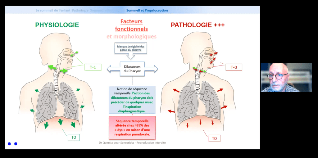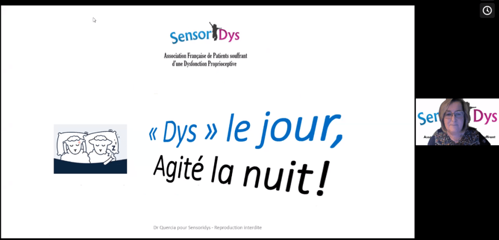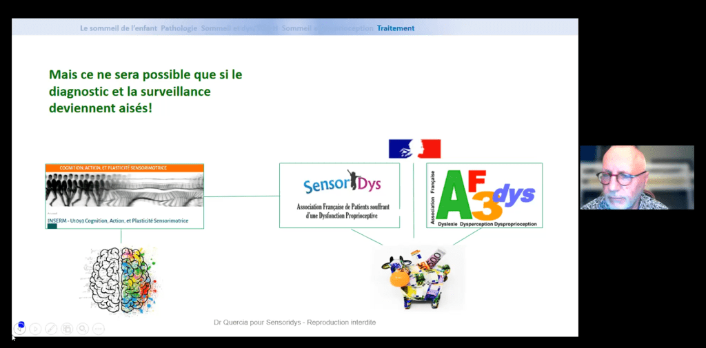 Le jeudi 21 octobre, le Dr Patrick Quercia nous a fait présenté le passionnant sujet « Dys le jour et agité la nuit ». Il a commencé par nous parler rôle du sommeil chez l’enfant, évoquant ensuite les conséquences nombreuses des troubles du sommeil chez cette catégorie de population (tant physiques que cognitives), leur présence fréquente chez l’enfant Dys ou TDAH, le lien entre troubles du sommeil et dysfonction proprioceptive et enfin de l’amélioration de tout cela grâce au traitement proprioceptif avec un impact majeur des exercices respiratoires sur l’amélioration des troubles du sommeil. Tout un monde de découverte qui s’ouvre à nous !