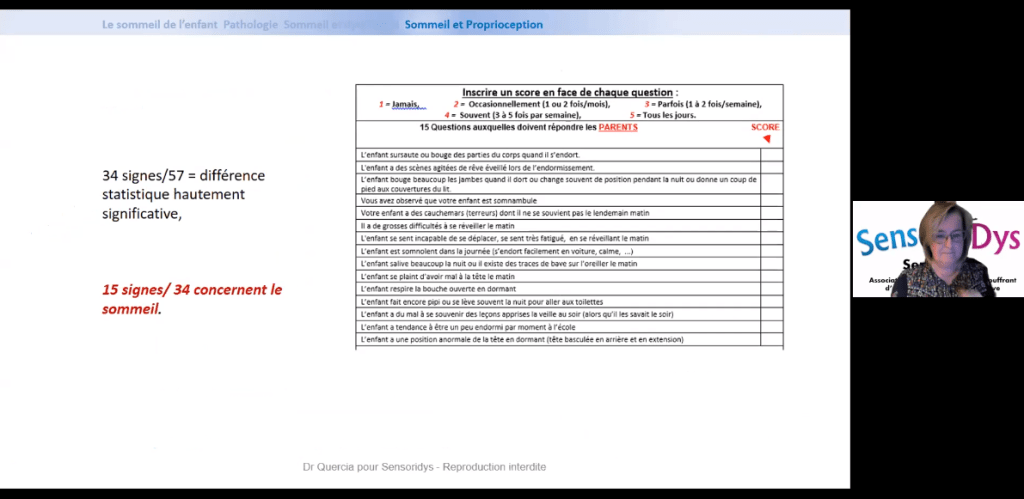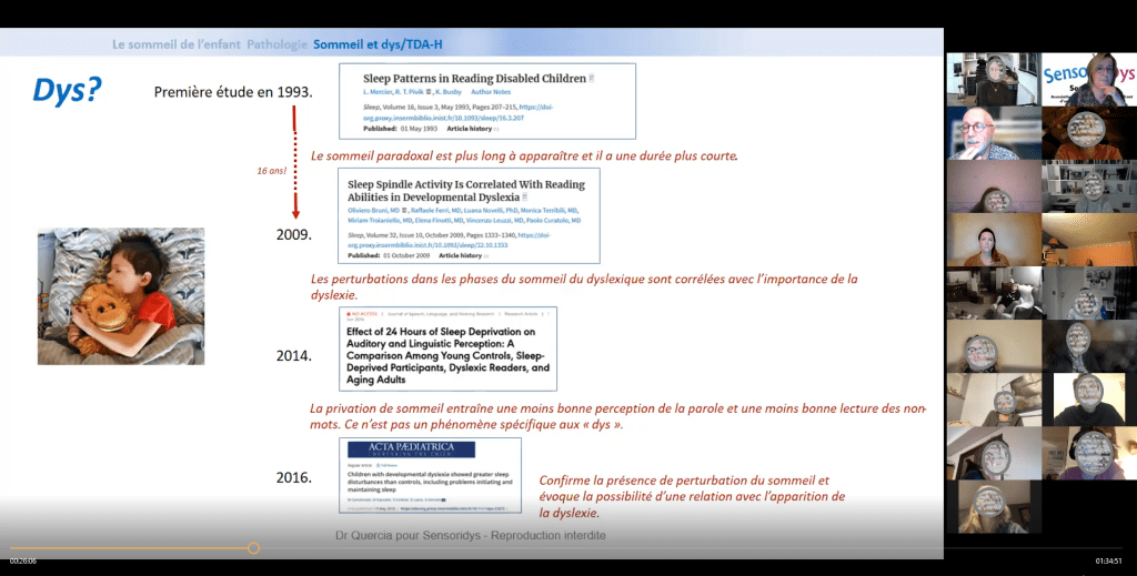 Il a terminé sa conférence en faisant une présentation rapide de l’étude sur le sommeil que Sensoridys va contribuer à financer, en lien avec l’unité INSERM CAPS (u 1093) de l’université de Bourgogne Franche-Comté. Dans cette étude, on va d’abord mesurer avant traitement, par actimétrie (montre connectée), le sommeil d’enfants dyslexiques avec troubles attentionnels, pour lequel sera aussi fait un bilan attentionnel à ce stade. Puis mise en route du traitement proprioceptif. Le sommeil de ces enfants sera réévalué quelques mois après traitement ainsi que leur niveau attentionnel. Sensoridys est très fière de pouvoir participer au financement de cette étude très novatrice, à peine trois ans après sa naissance. Tout cela grâce à nos adhérents et donateurs que nous tenons à remercier pour leur soutien.