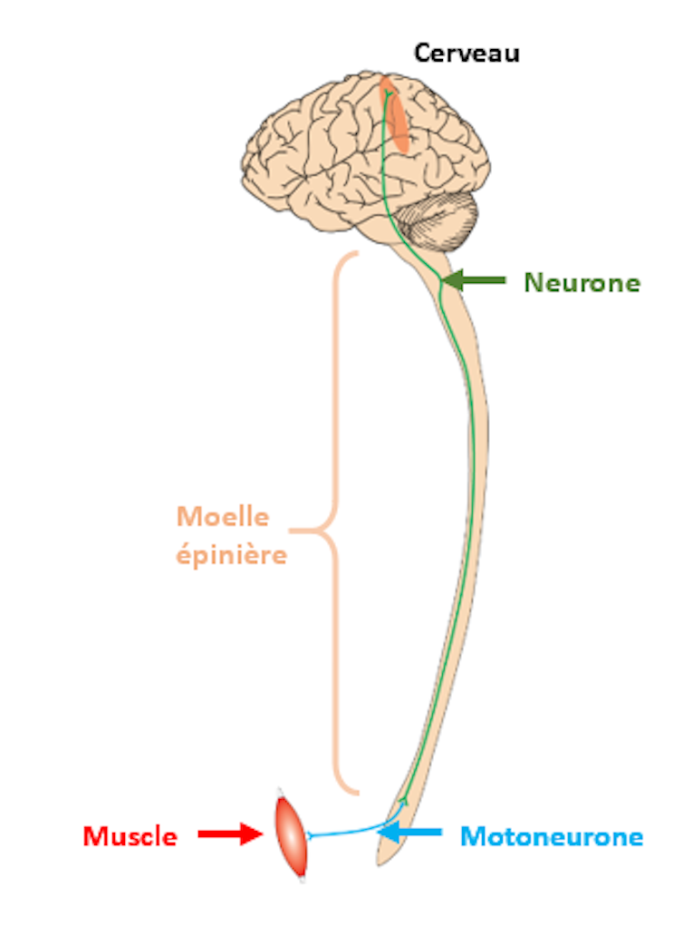 Le principe est donc très simple. C’est en réalité un peu plus compliqué car le câblage n’est pas fait de fils électriques comme on a dans nos maisons pour faire allumer la lumière, mais de cellules bien vivantes qu’on appelle des neurones. En plus, il n’y a pas qu’un seul neurone entre le cerveau et le muscle mais des milliers. Enfin, il y a au moins un relais c’est-à-dire que le message qui part du cerveau va cheminer le long de plusieurs neurones puis vont ensuite transmettre ce message à d’autres neurones qu’on appelle les motoneurones (parce que ce sont des neurones moteurs), qui eux vont le transmettre aux muscles qui vont obéir. Chacun de ces relais entre neurone et motoneurone et entre motoneurone et muscle s’appelle une synapse.