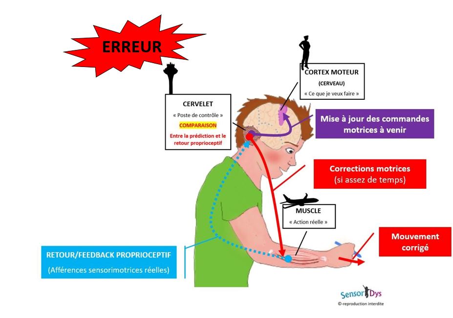 C’est pourquoi la nature nous a donné un autre moyen que l’on appelle « la copie d’efférence » : chaque fois que le cerveau donne un ordre de contraction aux muscles, il envoie une copie de cette information au cervelet (caractéristiques requises pour le mouvement à effectuer en terme de direction, de force et de durée). Ce dernier est constamment en train de vérifier si les informations proprioceptives et visuelles censées revenir lors du mouvement ordonné sont les mêmes que celles qui arrivent vraiment. Si ce n’est pas le cas, alors le retour proprioceptif est analysé plus finement, ce qui permet de corriger les éventuelles erreurs. Ainsi la proprioception est-elle utilisée essentiellement en cas d’erreur lors de la réalisation d’un geste, ou lors de l’apprentissage d’un geste nouveau, elle permet de corriger les erreurs. On dit que la proprioception est un correcteur d’erreur.