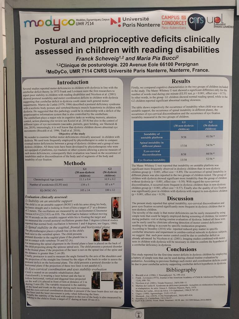 Franck Scheveig et Maria Pia Bucci exposaient aussi un poster très intéressant : Postural and Proprioceptive Deficits Clinically Assessed in Children with Reading Disabilities (Trad : Déficits posturaux et proprioceptifs évalués cliniquement chez les enfants ayant des troubles de lecture).