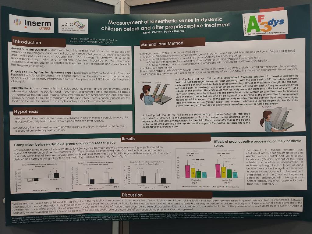 Kalvin Chavet et Patrick Quercia, représentant notre partenaire l’U1093 INSERM CAPS, y exposaient un poster : Mesure du sens kinesthésique chez des enfants dyslexiques avant et après traitement proprioceptif.