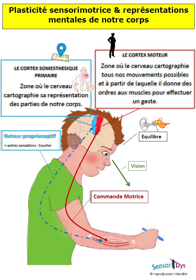 La plasticité sensorimotrice est à la base du traitement proprioceptif des troubles des apprentissages. Dans le schéma ci-dessous, on peut visualiser les deux aires du cerveau impliquées dans la plasticité sensorimotrice. Elle est en lien avec nos mouvements et notre proprioception, qui permettent la construction et la mise à jour des représentations mentales de notre corps : notre schéma corporel.