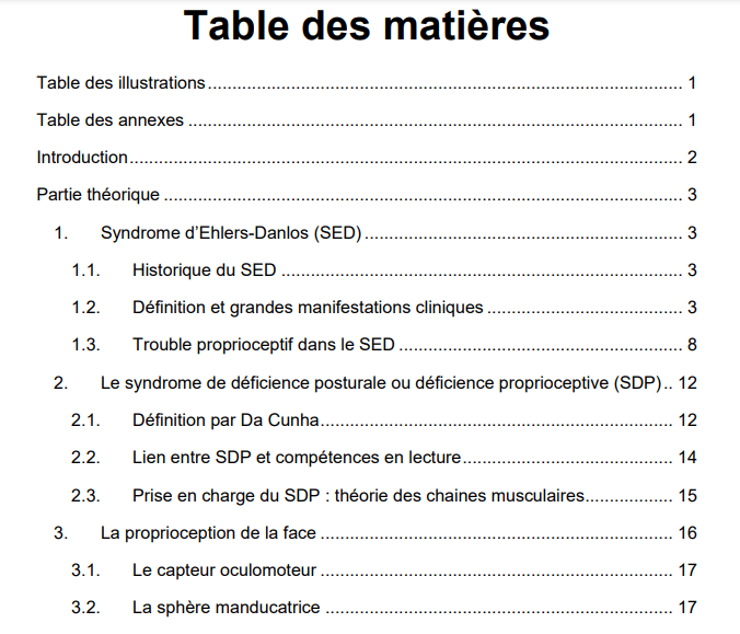 Je pense qu’il serait donc intéressant pour DFD d’explorer le lien entre dyspraxie, SED et SDP. Dans cet objectif, je les invite à découvrir le mémoire en vue de l’obtention du certificat de capacité d’orthophoniste de Joanna Thomas : Le lien entre la lecture et la proprioception chez des patients atteints d’un syndrome d’Ehlers Danlos. La partie théorique de celui-ci est riche d’enseignements sur le lien entre SED et proprioception.