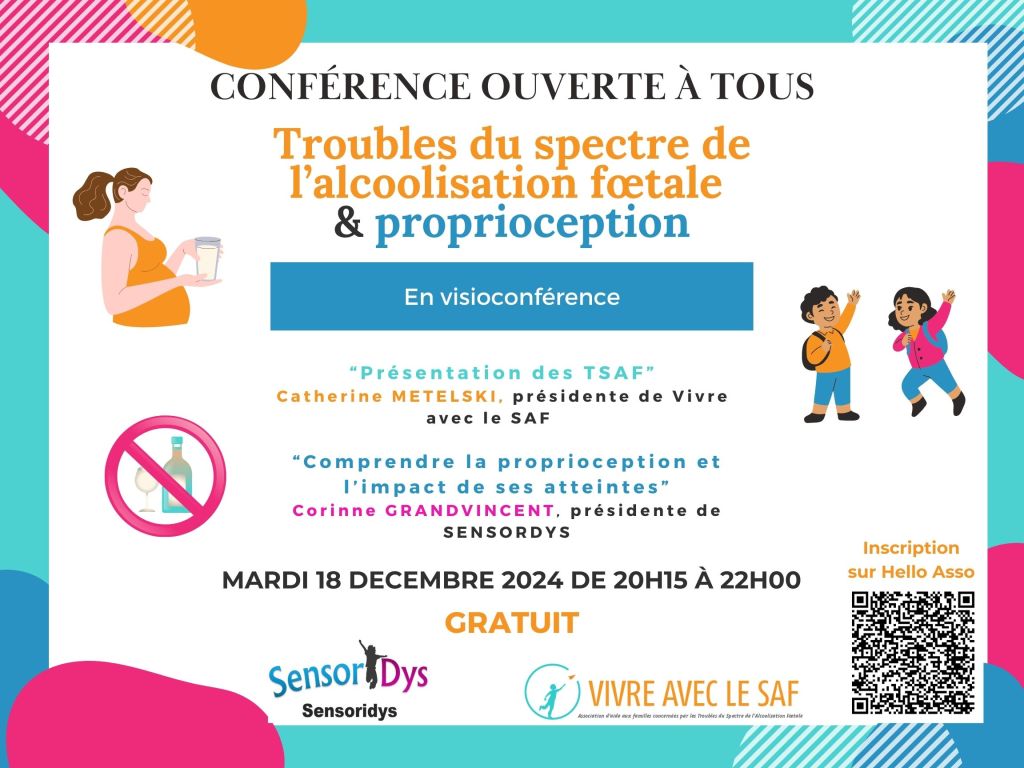 Afin de partager leurs connaissances et expériences, les associations Sensoridys et Vivre avec le SAF vous proposent une visioconférence ayant pour thème « Troubles du spectre de l’alcoolisation fœtale & proprioception”.