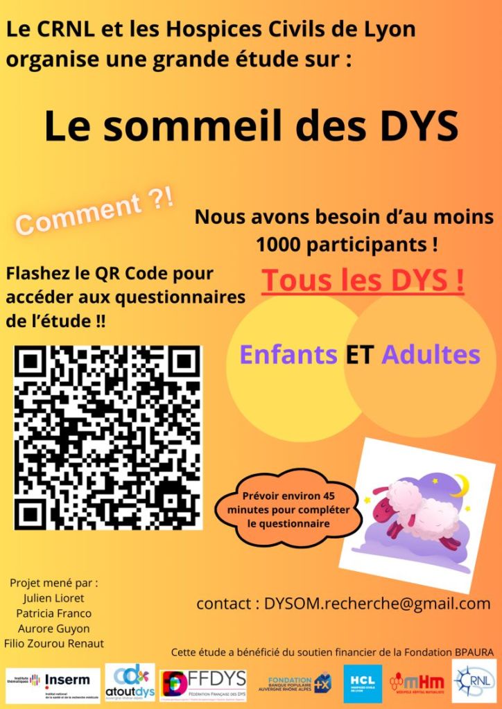 Je partage ici une étude lyonnaise du CRNL sur le sommeil, en cours, que Sensoridys trouve intéressante, car elle est très complémentaire de celle que nous avons contribué à financer (en cours de publication). Cette nouvelle étude s’intéresse au sommeil des Dys, quel que soit leur trouble : dyslexie, dyspraxie, dyscalculie, dysorthographie, multidys, et même Dys plus autres comorbidités. IL SUFFIT JUSTE D’AVOIR UN DIAGNOSTIC DE TROUBLE DYS !