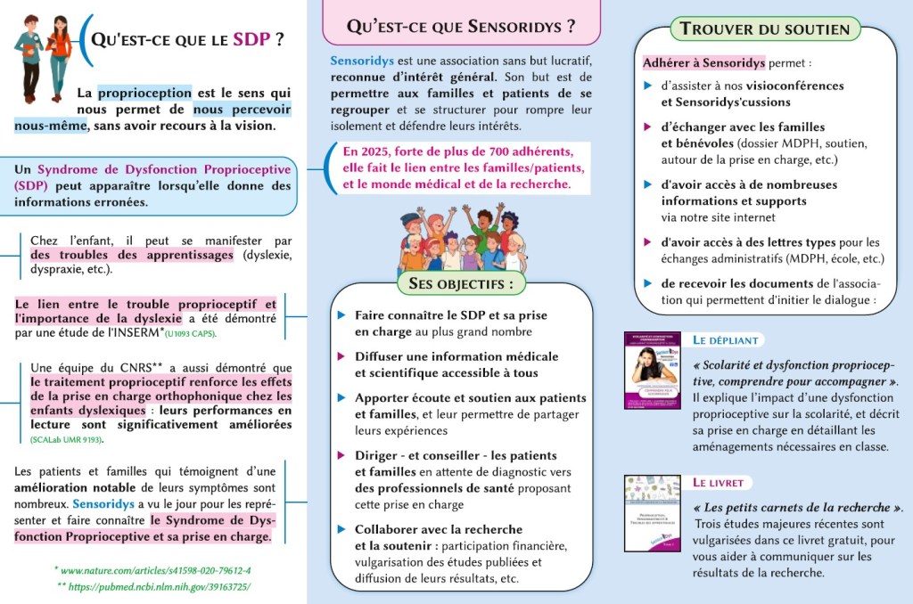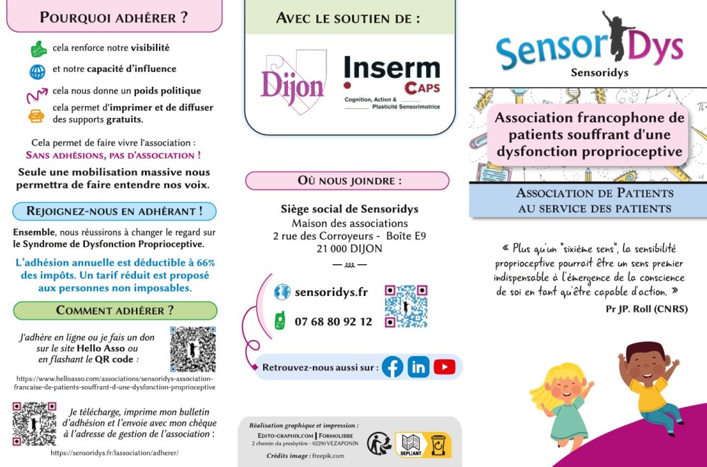 Ce flyer, ainsi que les autres supports de communication de l’association, est offert lors des événements où Sensoridys est présente comme les colloques, journées des dys, etc. Votre adhésion nous permet de les financer.