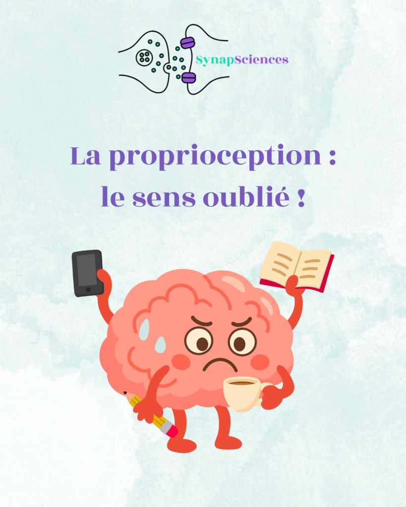 Je vous propose de découvrir une petite infographie sur la proprioception qui figure sur la page LINKEDIN de SYNAPSCIENCES, organisme dont le but est de vulgariser les neurosciences. Je trouve dommage qu’on ne puisse y accéder que via les réseaux sociaux, c’est pourquoi je me permets de la reproduire ici. Je vous invite vivement à vous abonner à cette page LINKEDIN qui fait de la vulgarisation scientifique sur les neurosciences, notamment sur la sensorialité avec des infographies concernant nos différents sens, et qui déconstruit le neuromythe des 5 sens. Sensoridys applaudit !