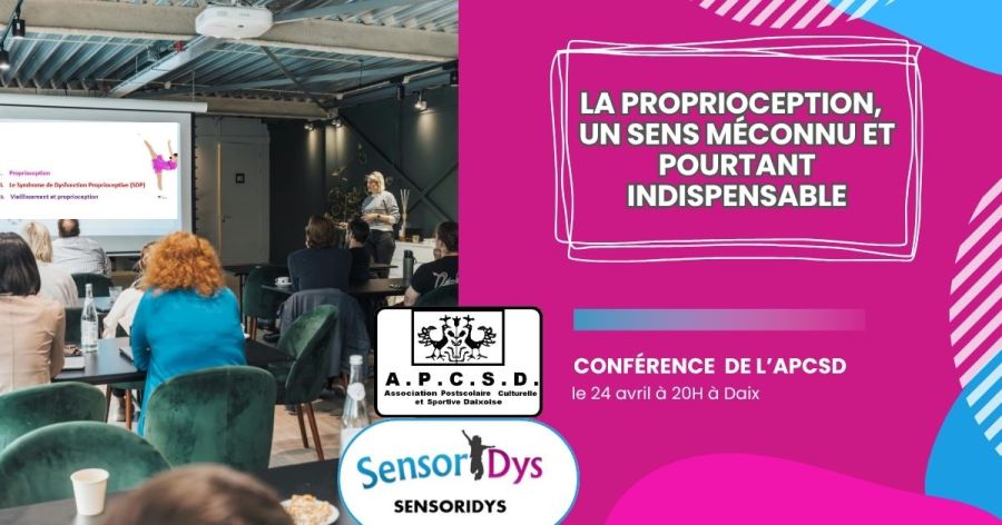 Le 24 avril à 20H, à Daix (Grand-Dijon), l'APCSD et Sensoridys vous invitent à une conférence gratuite, ouverte à tous : Nous connaissons tous nos cinq sens, il en existe pourtant un sixième : la PROPRIOCEPTION. Ce sens nous est si naturel que nous n’avons même pas conscience de son existence, pourtant notre vie et …