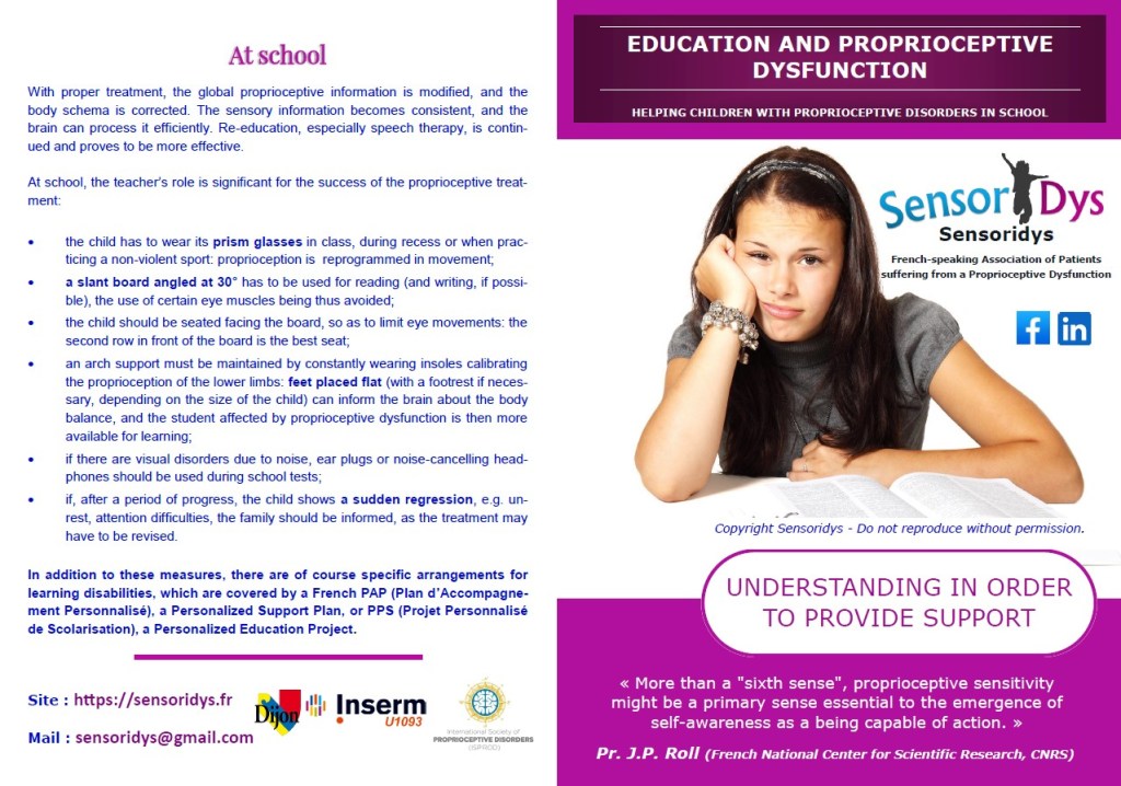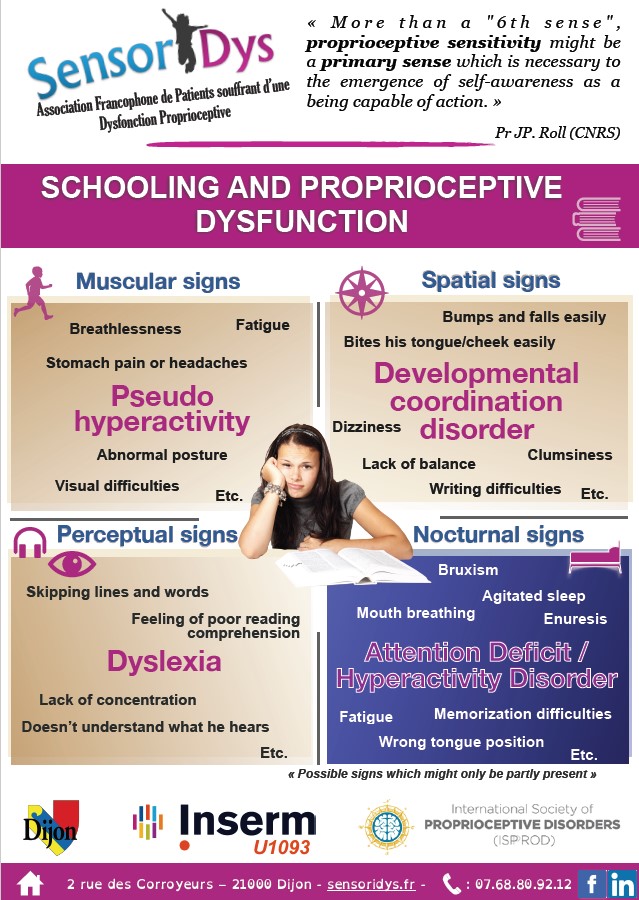 When proprioception gives erroneous information, it biases the construction of the body schema: the child does not stand straight while its proprioception make it believe it does. The information that the brain receives from the various sense organs is no longer consistent and sensory conflict appears. This results in several kinds of symptoms, different from one patient to another, some of which have a direct impact on education: